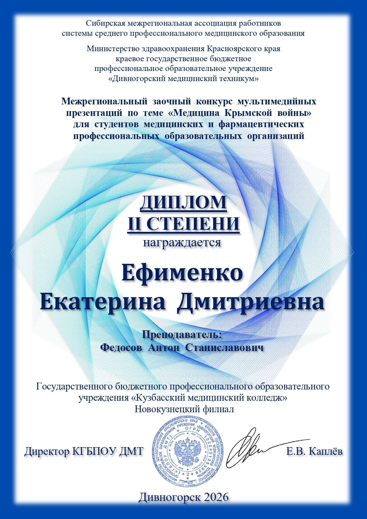 В марте 2026 года прошёл Межрегиональный заочный конкурс мультимедийных презентаций «Медицина Крымской войны». Организатор – Сибирская межрегиональная ассоциация работников системы среднего профессионального медицинского образования на базе КГБПОУ «Дивногорский медицинский техникум».